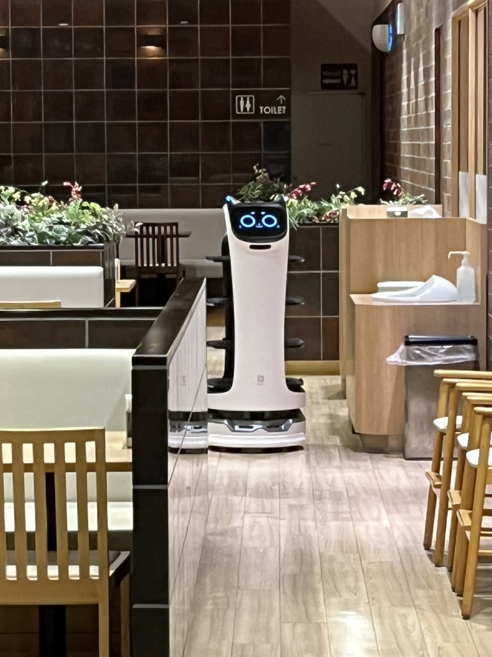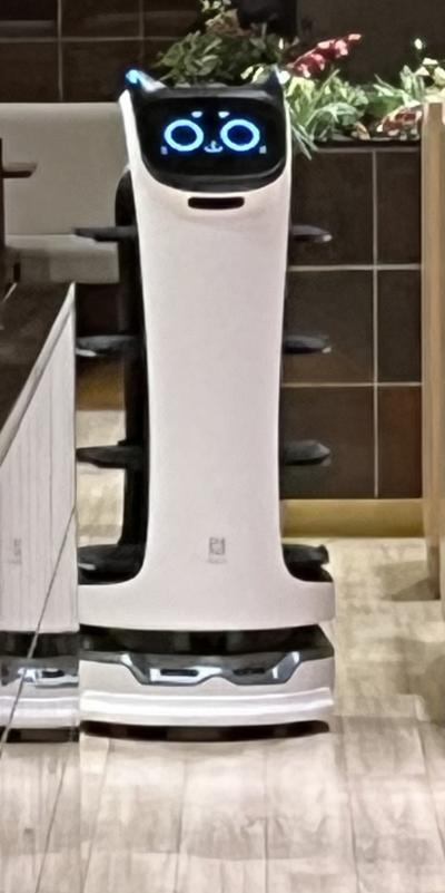 〈配膳ロボット〉が お料理を運んでくれるので、