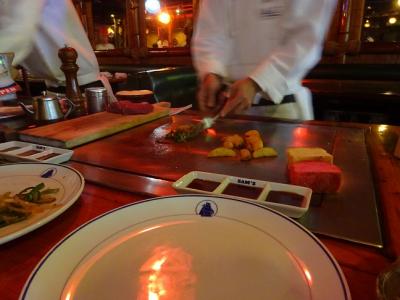 パフォーマンスありとのことで、あまり味には期待してなかったのですが、美味しかった。テンダーロインをお願いしました。カレースープ、サラダ、焼き野菜、ステーキ、と続きます。パンかライスかのチョイス。焼き具合も聞いてくれます。ステーキはスモールをお願いしましたが、十分でした。目の前で焼いてくれ、曲芸?並みのパフォーマンスは「すごーーーい」の連発。親も大喜びで楽しんでいたようです。- 旅行時期
