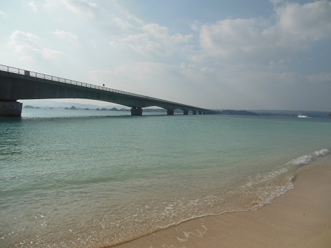 橋を渡る前の景色は本当に絶景です。ラッキーなことに晴天だったので、青い空と青い海で本当にキレイでした。海の色もいくつかの層に分かれていて、写真ではなかなか実物ほど美しく出ないのが残念ですが。橋を渡ったところのビーチの砂浜もキレイです。ただ、アジア諸国からの観光客が多く、ちょっと…というところがありますが(^_^;)…。ビーチにあるショップが道の駅みたいでなかなか良いです。