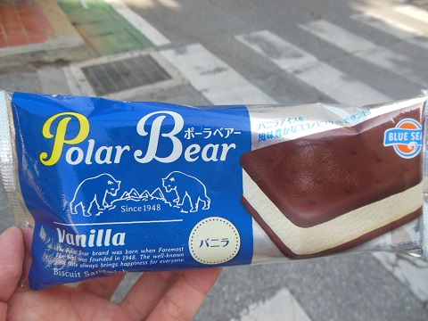 やはり沖縄に来たら絶対食べたい、ブルーシールのアイス。いたるところにお店があるので(直営店と出店)どこでも食べられます。パレットくもじの1階の直営店に行くと、「今日はシングルのお値段でトリプルにできますよ」と教えてくれ(10日と20日はそうらしい)、超ラッキー\(^o^)/。定番クッキーアイスをベースに、お店の女の子おススメの期間限定レアチーズクリームと沖縄らしい紅イモをのせました。ボリューミー~♪。あと、沖縄出身の友人に教えてもらった「ポーラーベア」のクッキーサンドはファミマなどに売っていますがこれもシンプルで毎日食べたくなる美味しさ♪