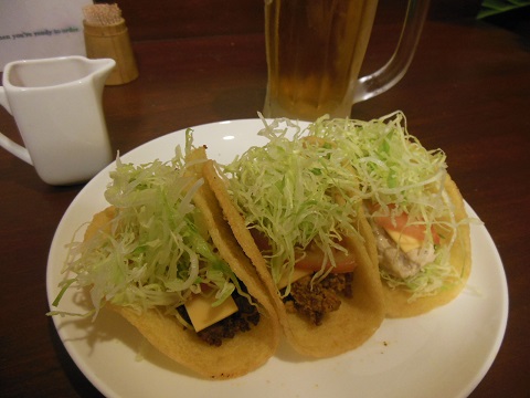 あまりお腹が空いていなかったので、軽いものをと思って行ってみました。2階のお店で、日曜日の18:30頃行くと女性一人のお客だけだったのですが、後からたくさん来られて結構満席になっていました。タコスはこぶり。3Pセットを頼みましたがツナはちょっと違うかな(^_^;)。ビーフはそれなり。ソースはマイルドとスパイシーが選べますが、スパイシーでも普通くらい。もっとピりっとしたのを期待しましたが。セットは+200円で生ビールに変えられるのは素敵♪。昔、アメリカのアリゾナで食べた本格的なタコスが超印象に残っている(めちゃ美味しかった)ので、若干味気ないですが、オヤツにはいいかも。