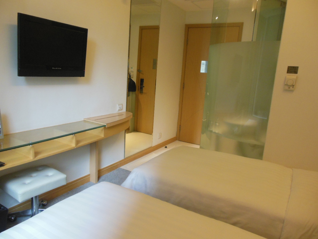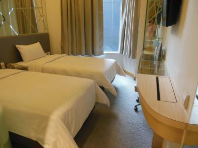 4トラベルのホテル名は、かつてのコスモになっていますが、今はドーセットモンコックです。MTRの駅からは確かに結構歩きますが、オリンピック・旺角の間くらいなので、いずれの路線も便利。10分程度なので苦になりません。オリンピックは空港との往来にスピーディですし、旺角はどの方向に行くにも超便利。ホテル周辺は、コンビニ、マンニン(スーパー)、ワトソンズを始め、お粥屋さん、麺屋さん、パン屋さん、点心のテイクアウト、マクドナルド…とチープなローカル料理が充実です。部屋は、ツインのシングルユースでしたが、キレイです。ただ、ここに二人だと狭いのと、トイレコーナーがガラス張り(大切な部分はスモークですが)で、落ち着かないと思います。バスタブはなくシャワーブースのみ。アメニティは揃っていました。ミネラルウォータも無料で毎日補充。エクスペディアを通して予約したのですが、ホテル直接だと部屋でWifiが無料になるサービスがあったので、残念。グランドフロアのロビーにいけば無料でWifi(結構速い)が使えます。香港のホテルはどんどん高騰しているので、便利な場所で最低限レベルだとものすごく高くなっていますので、1万円ちょっとの価格ならかなりお得だと感じます。次回もまたここにしたいと思います。
