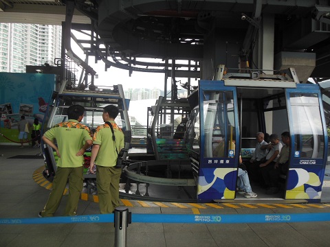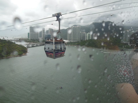 結構風がきつかったのですが(日本ならきっと止めているはず)、全く意に介せず運行していました。1ゴンドラに8人ずつ。クリスタルキャビン(底が強化ガラス)は、4つのスタンダードに1つくらいの割合。チケット買うまでかなり並ぶという情報が多いですが、6月の金曜日、13:30頃全く並ばず購入できました。ただし、乗るまでは25分並びました。中国大陸の人がものすごーーーく多いので、同じゴンドラに乗り合わせる可能性は大。25分も小さい空間に乗り合わせるので結構苦痛です(やかましい、動き回るのでゴンドラが揺れる!)。途中3~4中継地点を通過しますが、かなり高くて長い距離なので、高所恐怖症の人は若干気分悪くなるかもしれません。空港からS1バスで15分くらいです。到着日そのまま行くのが効率的かも~。