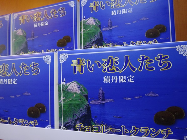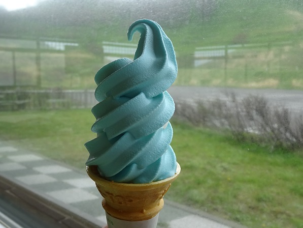 大きめのドライブインという感じで、お土産物も充実。食堂もかなり広くて観光バス客が相当入れそうです。ここの有名な青いソフトクリーム。ミント味でした。「青い恋人」や「積丹ブルーラムネ」などオリジナルもいろいろ。