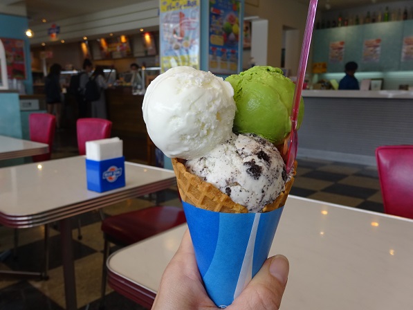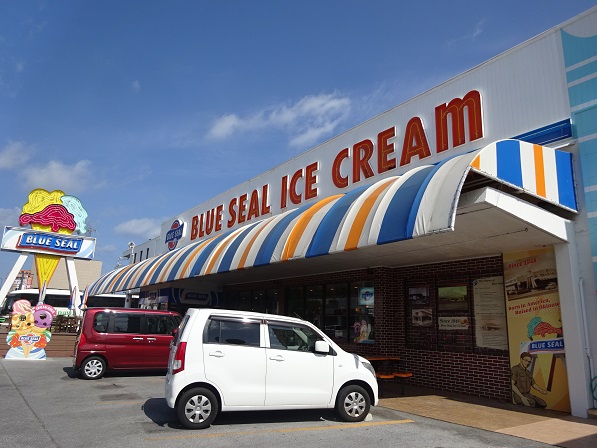 沖縄来たらやっぱりブルーシール。今回は、仕事で浦添に行く機会があり、帰りに歩いていける本店に行ってみました。10日だったため、シングル価格でトリプルの日にあたりラッキー\(^o^)/。前回もこの日に当たったのですが偶然とはいえ、嬉しい。種類が多いので迷います。本店はアメリカの古き良き時代の雰囲気もあって楽しめる。隣にアイスパークがあり、体験などもできるようです。路線バスを使っても20分程度で行けます。