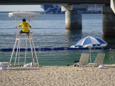 コンベンションセンターの裏側にある人口ビーチ。4月上旬はまだ海開きしていませんでしたが、たくさんの人々がくつろいでいました。人口ビーチなのでいかにもですが、水はきれい。もうすぐ花火大会があると、地元の方がおっしゃっていました。コンベンションセンター前から路線バスも30分に1本程度出ているので、車運転しない方でも行けます。周辺もお店などが多い。