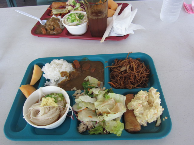 昼食はビュッフェで、カレーは普通のと辛いのと2種類、焼いたチキン、焼きそば、春巻き、ソーメン、サラダ、フルーツ。飲み物はお水とアイスティー。