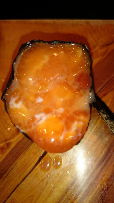 それと、イバラガニの内子を最後に。めちゃ美味しい。トロッとした内子、生卵とウニを一緒にしたような味。奥さん曰く、これは美味しいので、外のものが霞んでしまうので、注文されても、最後にしか出さないとのこと。 納得!- 旅行時期