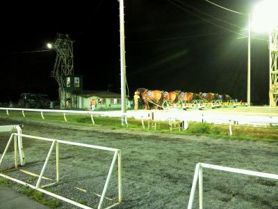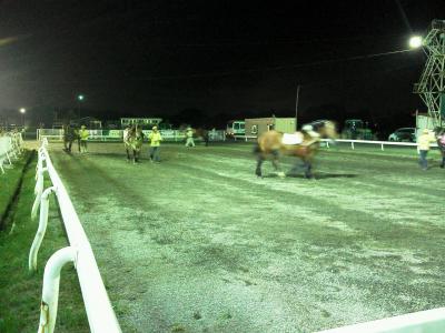 ナイター競馬。馬がでかい。ナイターの光をあびて、その姿は頼もしい。さて、出走。走るというよりも、歩いているのか。馬券を買った馬は、中段。先頭は最初の障害に。オオット、先頭の馬が、障害物の上で一休み。その間に、他の馬たちが追い抜いていく。でも、平坦な道で、また、もとの先頭にいた馬が抜き返す。しかし、また、その馬は、次の障害物の上で一休み。