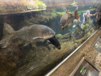 淡水魚達のコーナー。娘は大きい魚が怖かったらしく、「小さい魚ー!大きい...