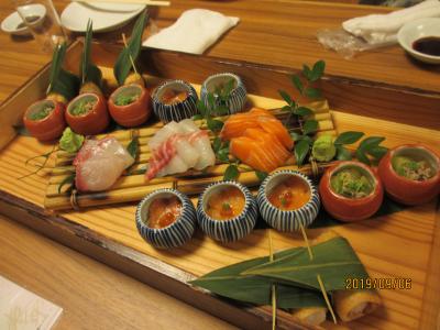 今晩のメニューはもつ鍋。前菜の刺身たち。
