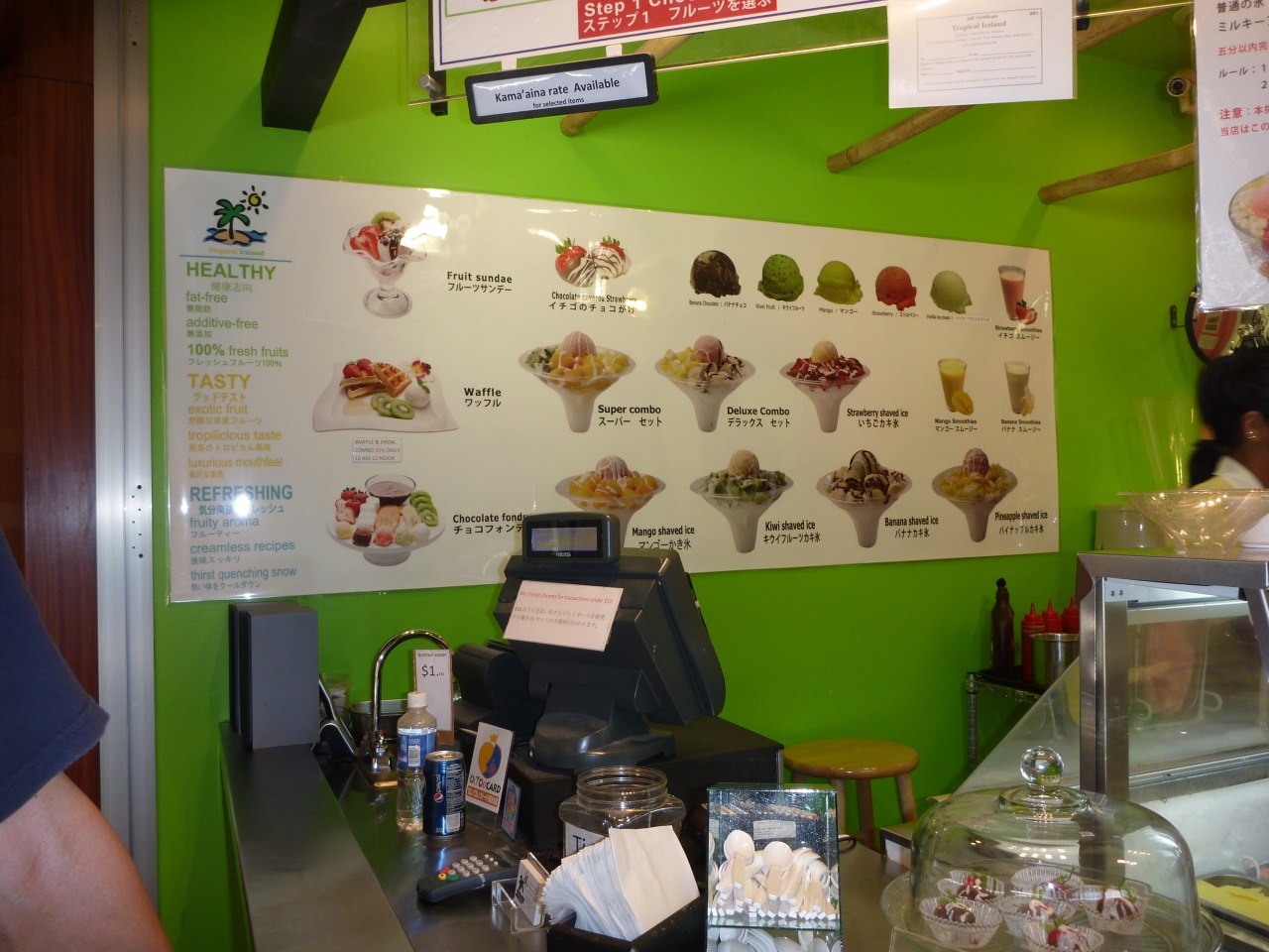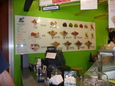 ひと言:かき氷、アイス、フレッシュフルーツを組み合わせていろーんなかき氷が楽しめます。たくさん歩いた後にはサッパリしておいしい♪今回私達はストロベリーどっさりの一番大きいのを2人で食べました。甘くなくて味はGood!とは言え、約8ドル(2010年7月)と安くはない・・・?ちなみにイチゴが一番高かったです。- 旅行時期
