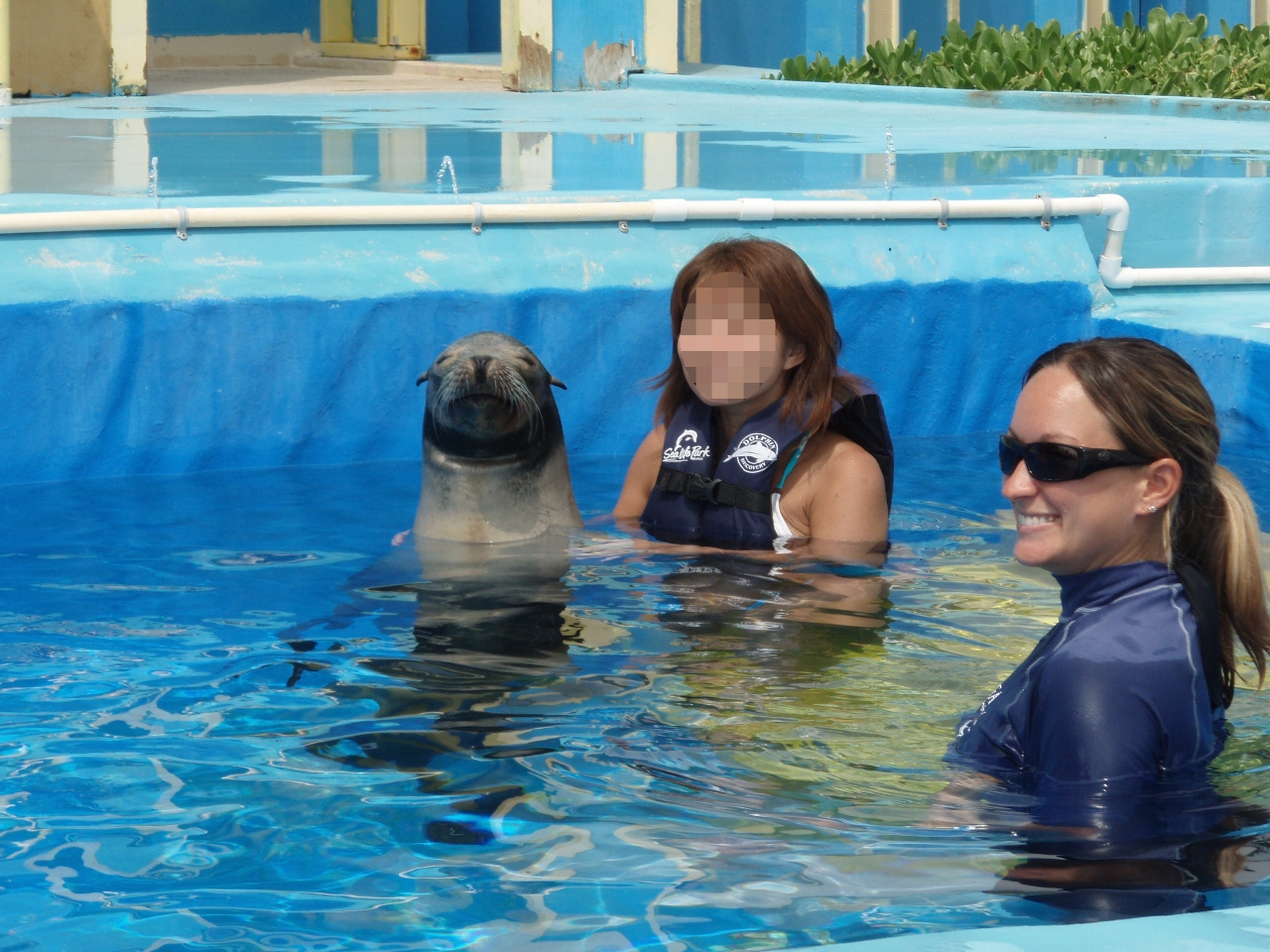 シーライフパークといえばイルカ!でもここにはアシカと遊べるプログラムもあります。アシカ好きの私が参加したのはこれです。実はこの年、カンクンにアシカ目当てに行ったら、イスラ・ムヘーレスではなくなっていて、泣く泣くイルカプログラムに参加・・・そしたらナント!ハワイにはあるじゃないか!と参加しました。参加人数はこの時でたった2人。ゆったりでした。ちなみにこの時は英語のみで行われました。日本語しかダメな場合は申し出たら何かしら対処があるかも。園内は狭く、時間つぶしはもったいないので、私たちは自力で帰りはバスでココ・マリーナまで行って、食事、ショッピングを楽しんできました。もちろん先に帰る旨、ドライバーに伝えて・・・バス代で+2.00ドルにはなりますが、貴重な時間を思えば、有りでは。