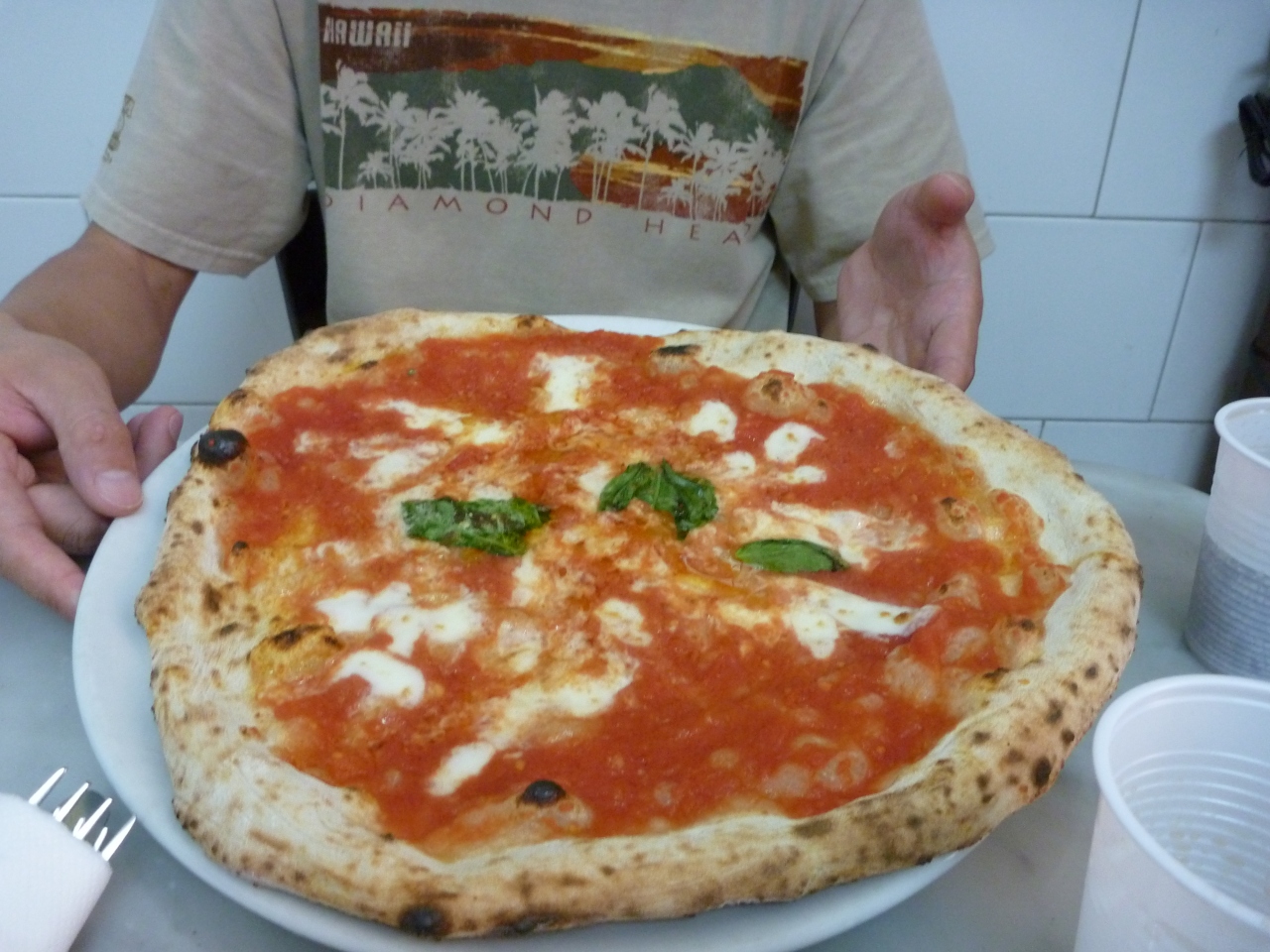ひと言:ナポリのピザ屋さんでは1,2を争う有名所です。店内は食堂のような雰囲気です。味は・・・一瞬「?」と日本の某宅配ピザになれていると物足りなさを感じます。ところがすすむにつれ、これがナントおいしい!生地の食感と素材の持ち味がしっかり出ていて、これが本当のピザか・・・と。いくらでもいけちゃいます。