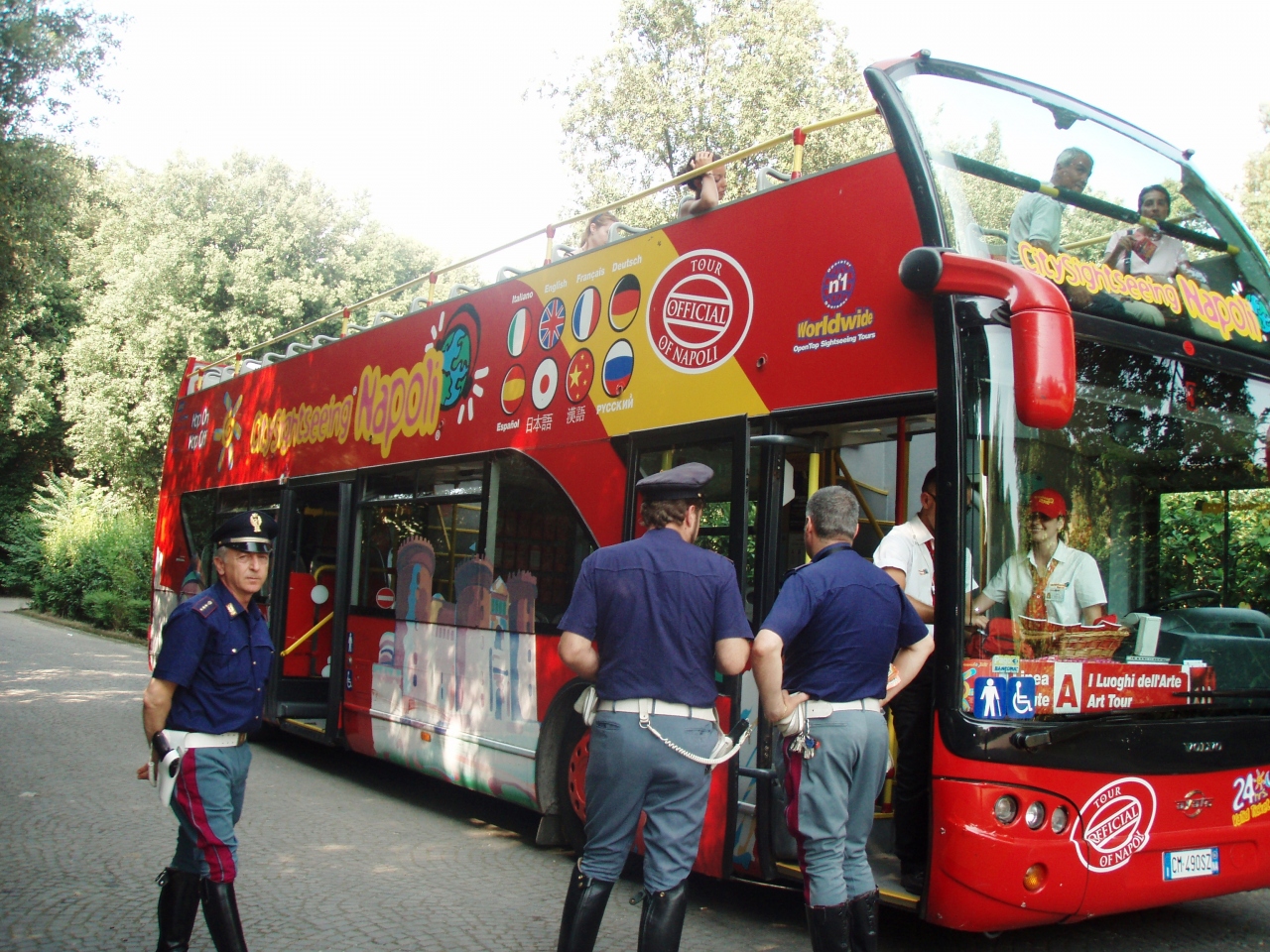 ナポリの観光名所を回る2階建てバスがあります。個人旅行で行った私たちこれを利用しました。自由に乗り降りできるのが利点。3路線有。ヌォーヴォ城前が始発で、チケットブースも有。1日1人20ユーロ(当時)。安くはないですが、公共のバスと違いスリなどの心配が少ないと思い利用。ちょっと変な日本語だったりしますが、日本語の音声ガイドもありました。屋上は眺めもいいし、風も心地よく楽しめました。