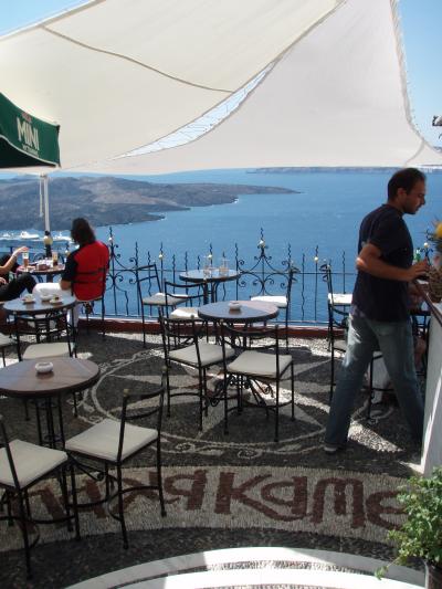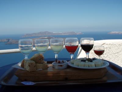 サントリーニはワインで有名ですが、時間があったらぜひ「サントワイン」で絶景を眺めながらワインテイスティングを。 場所:ピルゴス。フィラタウンからバスかタクシーで15分くらい。私達はスクーターを借りて行きました。サントワインでのテイスティングを含んだ島内観光ツアーもあります。25ユーロ。 予算:6種類+チーズなどで10ユーロ、12種類+チーズなど(料金忘れてしまいました)、1グラス 1ユーロがあります。 その他:お店の中にはお土産もたくさん(もちろんワインも)売っています。