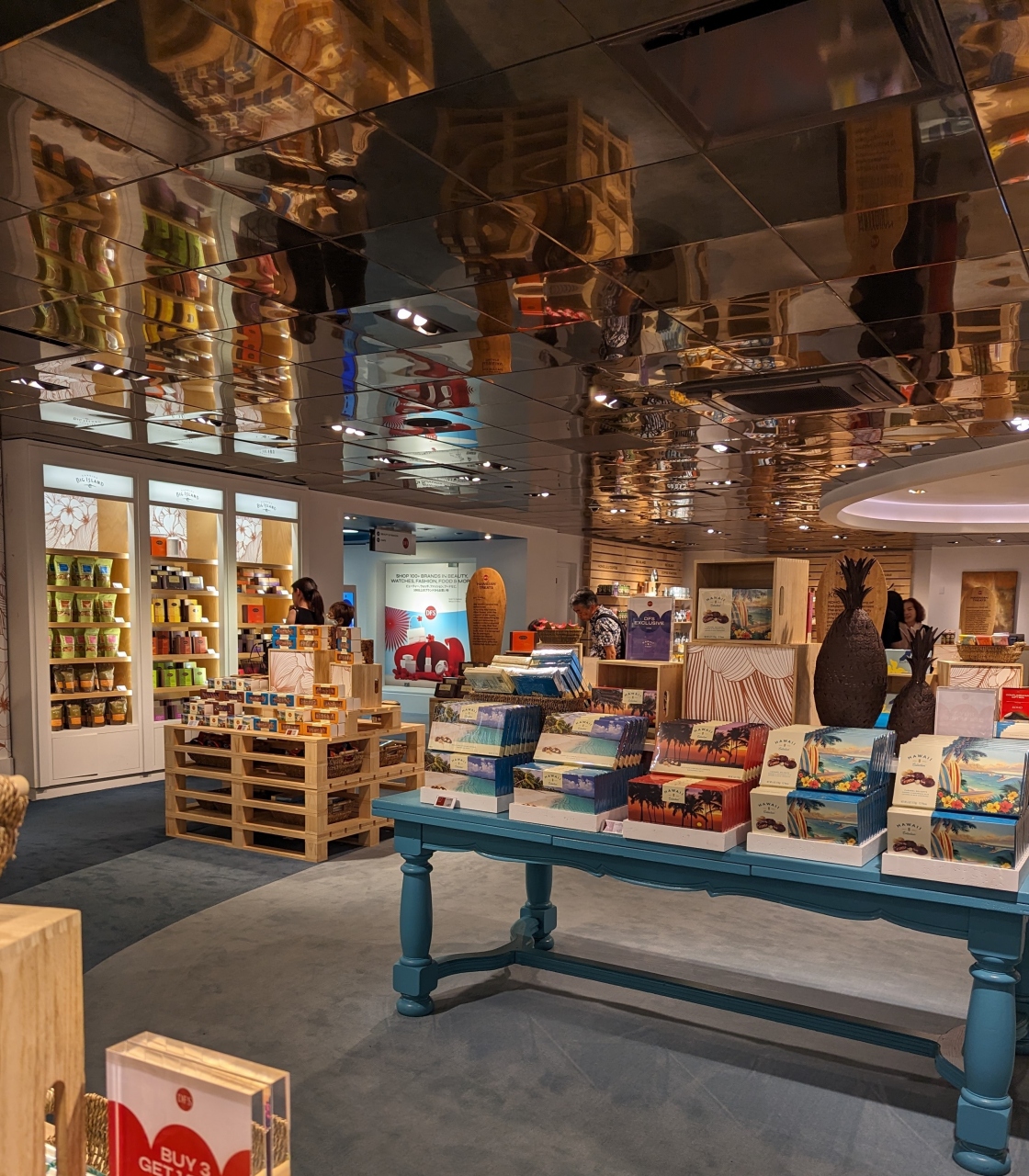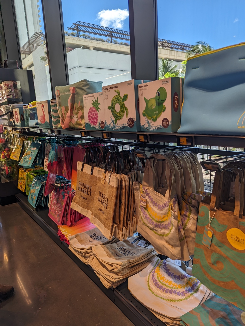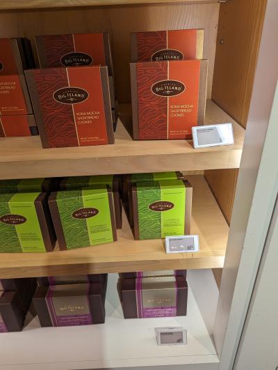 パンデミック前のまだ1/3程度の品揃えではあるものの便利なDFS。2023年10月頭現在で、1階のみオープン、品揃えは前に比べれば少ないながら、コスメ、ファッショングッズ系、ブランドショップがあります。この時点で22時までのオープンで、最終日のおみやげ駆け込み寺かも。以前の23時までになればもっとうれしい・・・ おみやげコーナーもまずまず充実で、ホノルルクッキーカンパニーのクッキー、ビッグアイランドキャンディーズのクッキー、KOHOのチョコなど、価格は高めながらそろっています。空港内もオープンしているので、フライト前に時間取れる方は最後の最後は空港で。