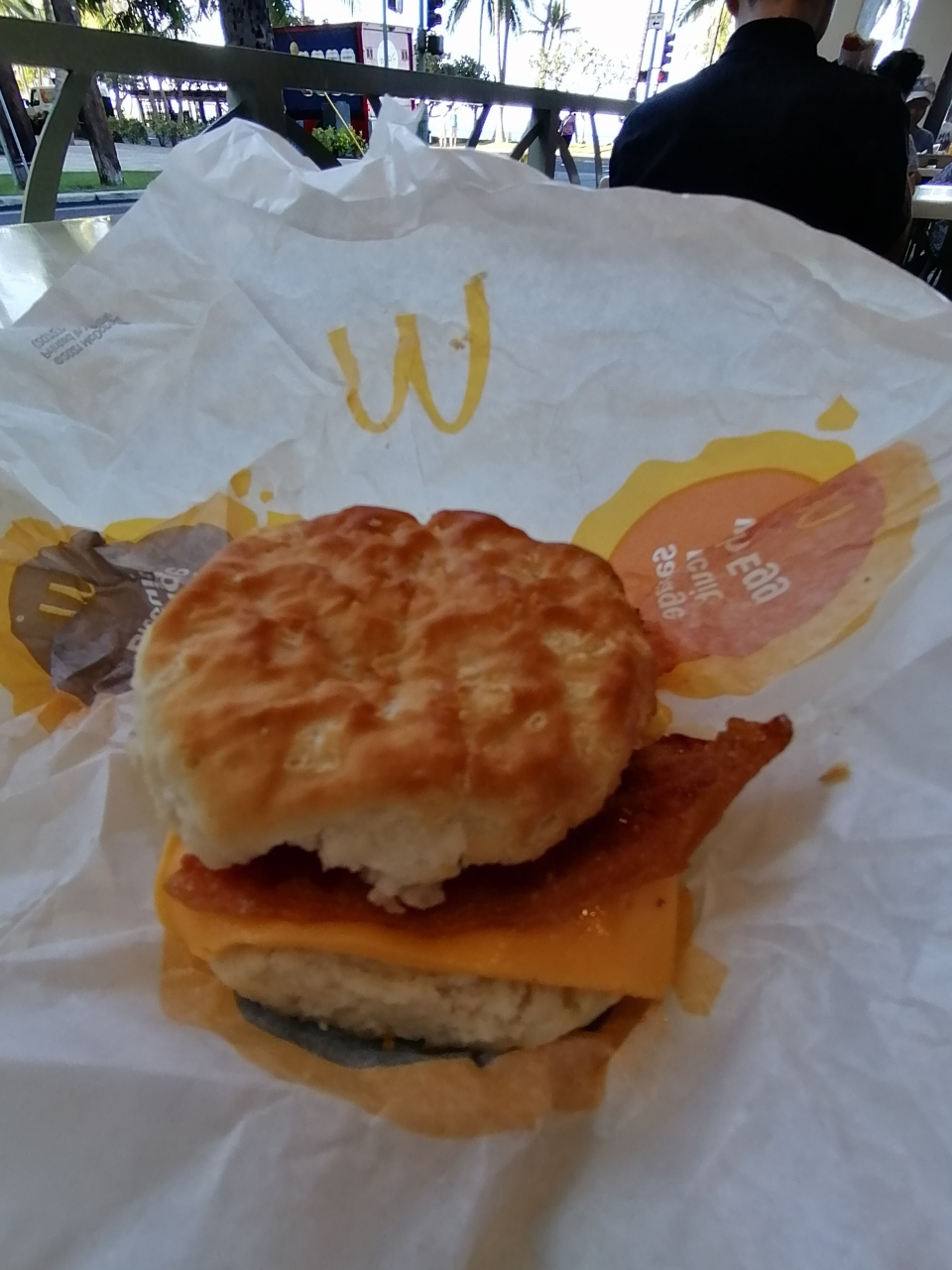 カラカウア通りにあるオーシャンビューマックです!テラス席からは通りを挟んで海が!オーダーはタッチパネル方式です。ハワイならではのメニュー、日本にはないブレックファストメニューがあるので、トライしてみてください。個人的には日本にはなぜか来ない朝食メニューのビスケットが好きです。。。