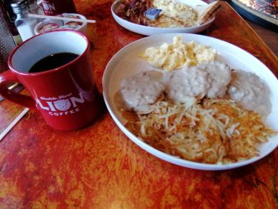 朝7時からやっているので、チョット早いフライトでも、朝最後の朝食がいただけます。カラカウアに面した窓際(窓はないですが)の席は3つくらいしかないので、席にこだわるなら、7時開店同時に行くのがベターです。ハンバーガーが有名、おいしいお店ですが、アメリカンなボリューミーな朝食もありますよ。