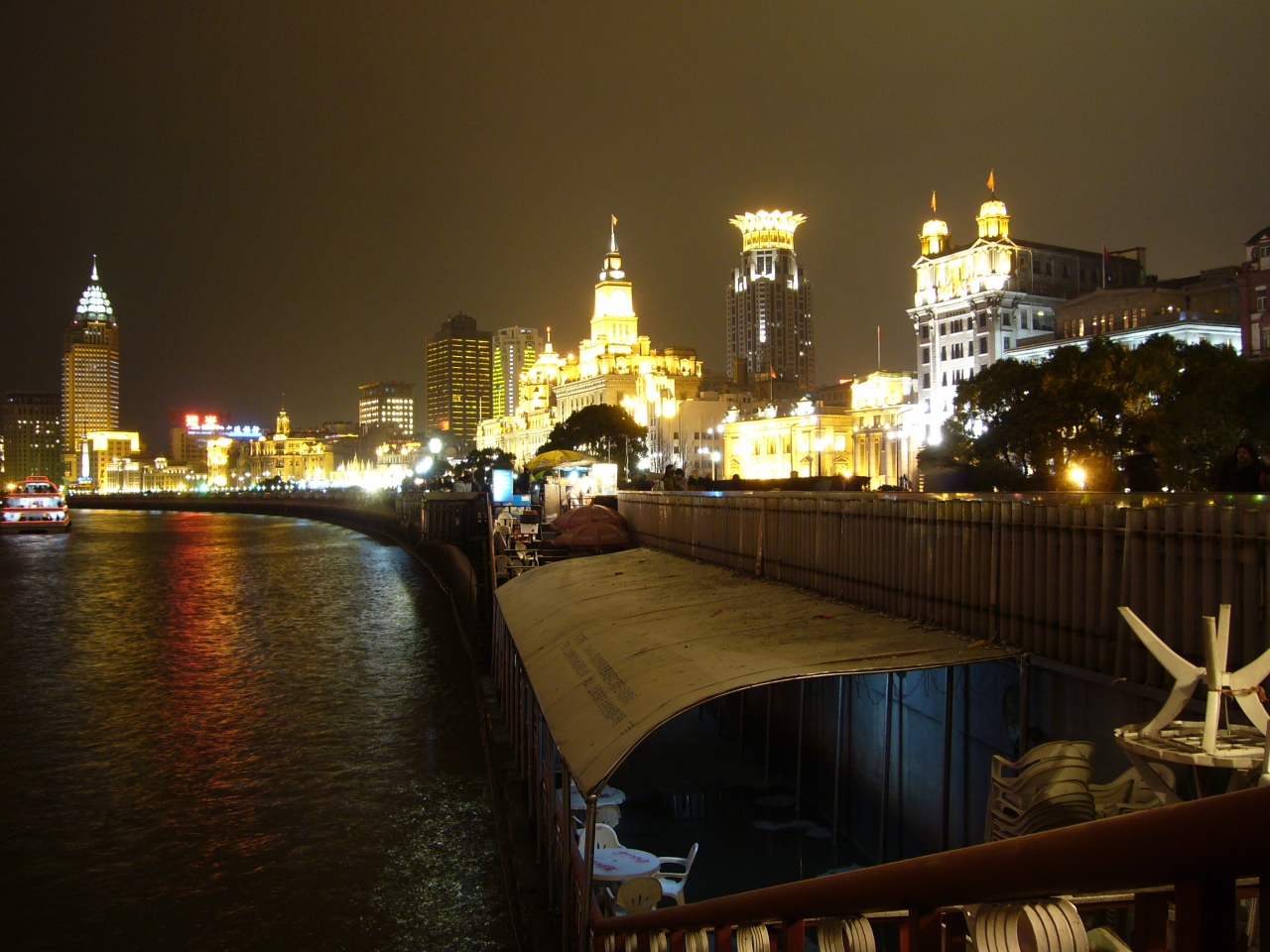 黄浦江を挟んで片方はイギリス租界時代のレトロな建物でライトアップも暖色系の一色に揃えています。もう片方はテレビ塔や上海ヒルズなどの近代的な建物でライトアップの色もホワイトやブルーなどのシャープな感じになっています。