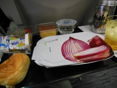 またまた機内食。おやつ?にパニーニとフルーツケーキが出てきた。げぷっ・...