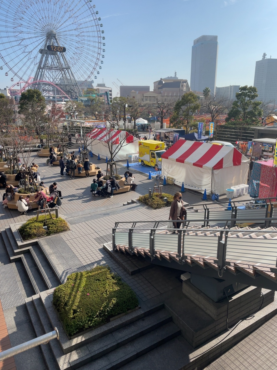 クイーンズスクエアの外、コスモワールドの目の前に位置する広場です。週末になると多くの人が飲食を楽しんだり、イベントなどが行われています。訪れた日は沖縄チャンプルーカーニバルが開催されており、沖縄のご当地料理などが販売されていました。たっぷり陽を浴びれる気持ちいい場所です。