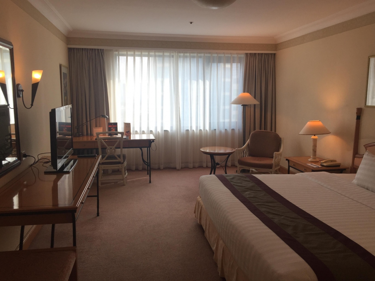 部屋自体若干古い作りですが、頑張って手を入れている印象です。古いホテルの場合、コンセントが少なく困ることが多いのですが、当ホテルも少し離れた場所にしかコンセントはありません。ただし、ホテルの客室にしては珍しく、自由に使える延長コードが置かれており、コンセント問題はそれほど気になりませんでした。