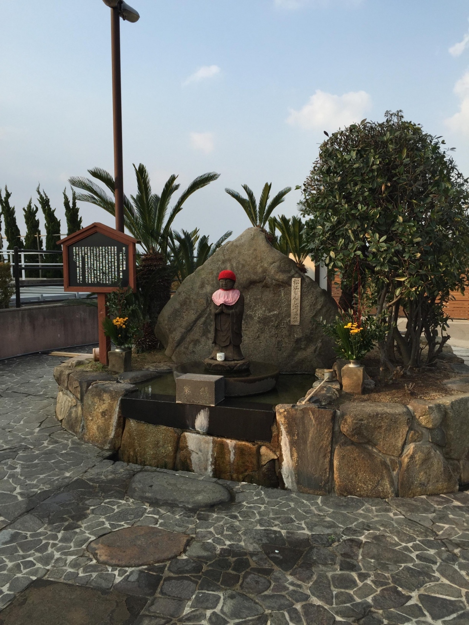 松江しんじ湖温泉の外れ、町の中心街から離れた方にひっそりと祀られているお地蔵さんです。すぐ脇を一畑電鉄が走っていますので、気付く人は気付くかも知れませんが、知らずに通り過ぎる人も多いのではないかと思います。この場所にも温泉が湧き出ていますので、そのお湯を掛けて手を合わせれば、健康と幸せになれるという言い伝えが残っているそうです。宍道湖からも近いので、散歩がてらに寄ってみるといいかも知れません。