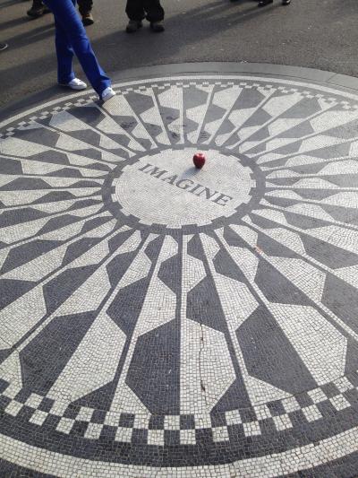 セントラルパークの西側、ダコタハウスからすぐのところにジョン・レノンのために作られた「ストロベリー・フィールズ」という小さな広場に、イマジン碑があります。実際に行ってみると、思ったより碑は小さく、なのに人が大勢いるのでシャッターチャンスは少しの時間しかありません。自分を入れた形で記念撮影をする人の列が出来ていて、その人達の入れ替わりのタイミングで碑の写真が撮れる感じです。時間にもよるかも知れませんので、空いている時間に行けたらラッキーですね。