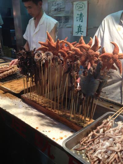 王府井小吃街は王府井のほぼ中央あたりから横道に入ったところに広がるアメ横のような、屋台やお土産屋などが連なる商店街です。写真のように動いているサソリやヒトデを串刺しにしているものも売られていました。これを焼いてもらうのか、それともそのまま食べるのかは分かりませんが、人が多く集まっていて皆写真だけ撮っているように見えました。北京訪問の初日の夜でしたのでお土産はここでは買いませんでしたが、お店も多く、ここにしか売っていないものも探せば見つかるかも知れません。