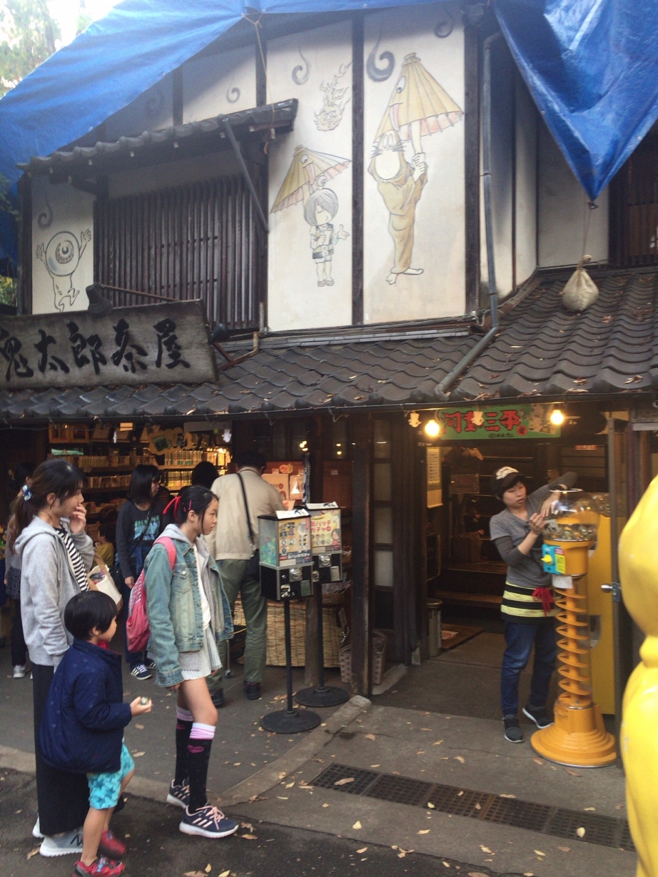 連続テレビドラマ以降も賑わいを見せている水木しげるさんのおなじみ「ゲゲゲの鬼太郎」がテーマとなった売店です。奥には喫茶スペースもありますが、そちらには今回入ってはいません。周辺の建物とも絶妙にマッチした佇まいで、店頭は鬼太郎などのオブジェが飾られていることもあって、写真を撮る人の列が出来るほどでした。建物自体もよく見てみると色々隠されているので、実際行く機会があれば探してみてください。