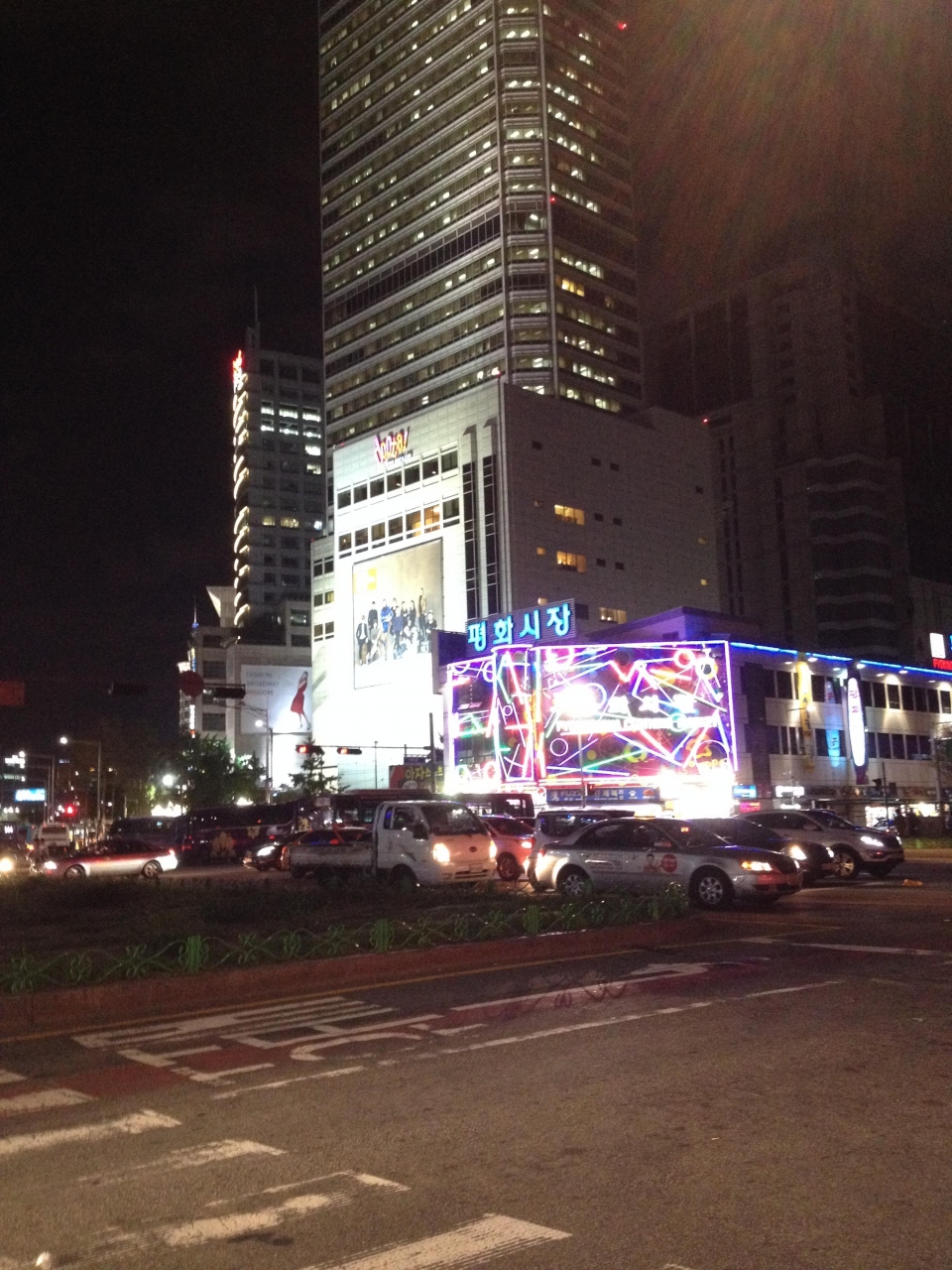 東大門の近くに広がる東大門市場を観光するため訪れました。夕方を過ぎており既に暗くなっていましたが、様々な色のライトが煌びやかに灯っており、舞台のようなところでストリートパフォーマンスをしている人もいました。駅前とは異なり人もすごく多く、露店なども多く出ており非常にエネルギッシュな雰囲気でした。人が多いこともあるため、スリなどには注意した方がいいかも知れません!