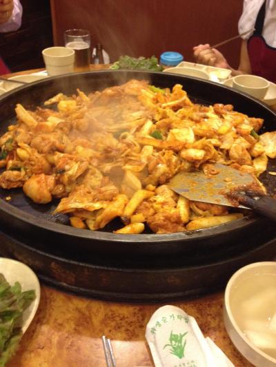 机には最初からダッカルビ専用の大きな鉄板が設置されており、目の前で調理が進みます。今まで食べたことはありましたが、ここまで本格的なダッカルビは初めてでした。お店の中は、仕事帰りの人や学生らしき人など多くの人で賑わっており、みんなダッカルビを食べています。結構な量がありましたが、あっと言う間に食べ終わり締めにご飯を注文!鉄板に残った具やソースと一緒にご飯をいためて食べましたが、お腹いっぱいでとても美味しかったです。