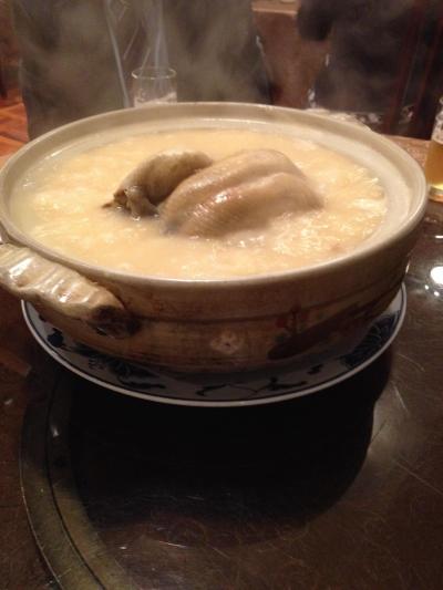 忠孝敦化の駅から約10分ほど、敦化南路沿いの静かなエリアにお店があります。鍋料理だと聞いて行きましたが、地鶏を丸ごと使った「砂鍋土鶏」という名前のスープが名物のようです。注文してみましたが、コラーゲンがたっぷり取れそうな濃厚なスープ料理でした。4人で食べきるには量が多く、結局残ったスープを持ち帰ることになりましたが、他のテーブルを見ても結構持ち帰っている人が多く、結構人数がいないと食べきることは難しいのでは、と思いました。