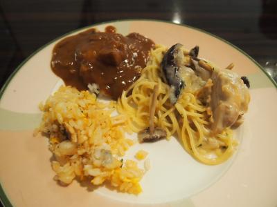 目玉のステーキと蟹のほか、オムレツ、ピザ、パスタに冷やし中華等ありました。