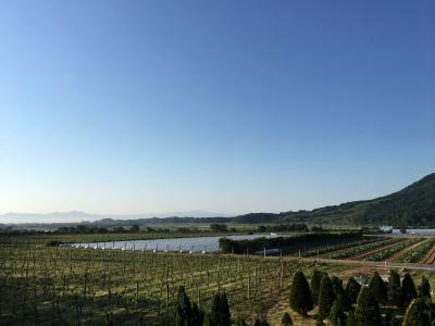 部屋からの眺め。ブドウ畑と角田山が見渡せます。