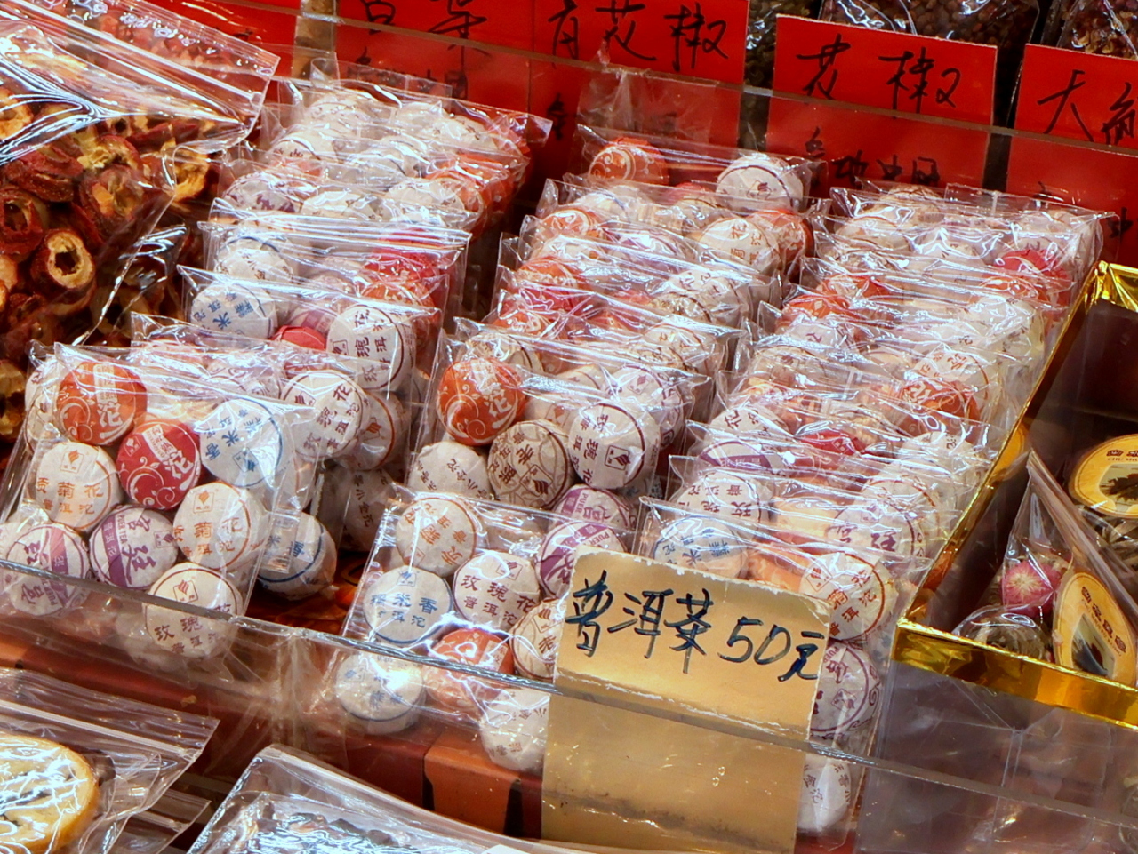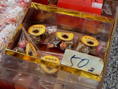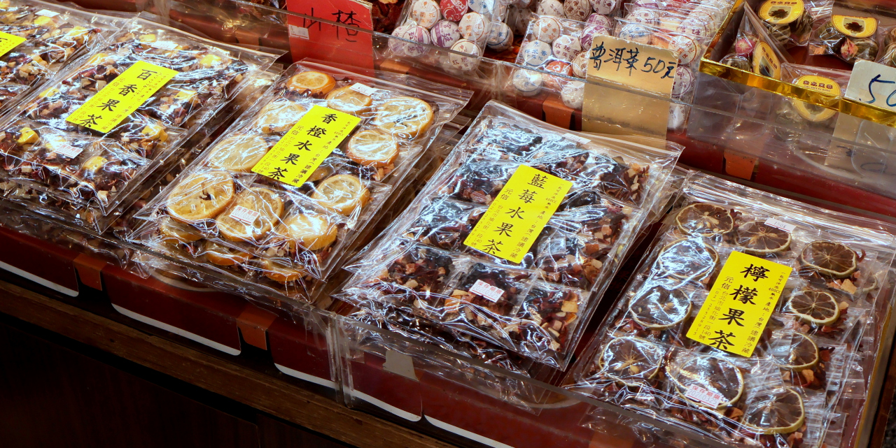 「迪化街一段」沿いにあるドライフルーツなどを扱う乾物屋さん、配り用に買ったハーブティーが好評