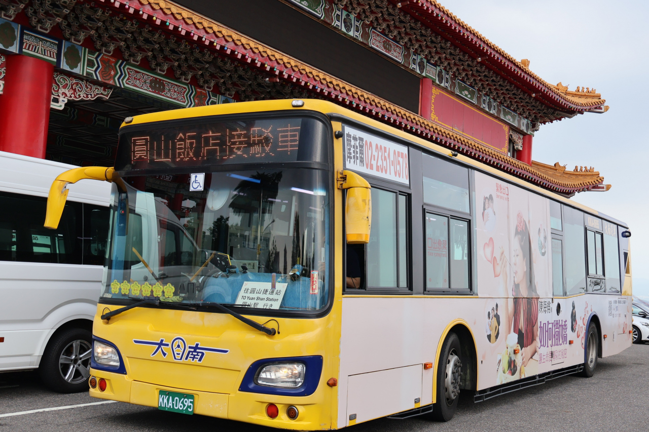山の上の「圓山大飯店」へは黄色いシャトルバスを利用。地図がおおざっぱすぎてわかりにくいのですが、MRTの丸山駅から乗る場合は、バスターミナルを道を挟んで左手に見ながらまっすぐ進むと乗り場があります。