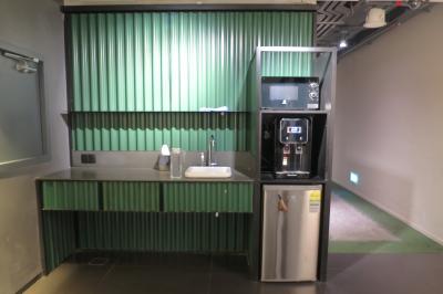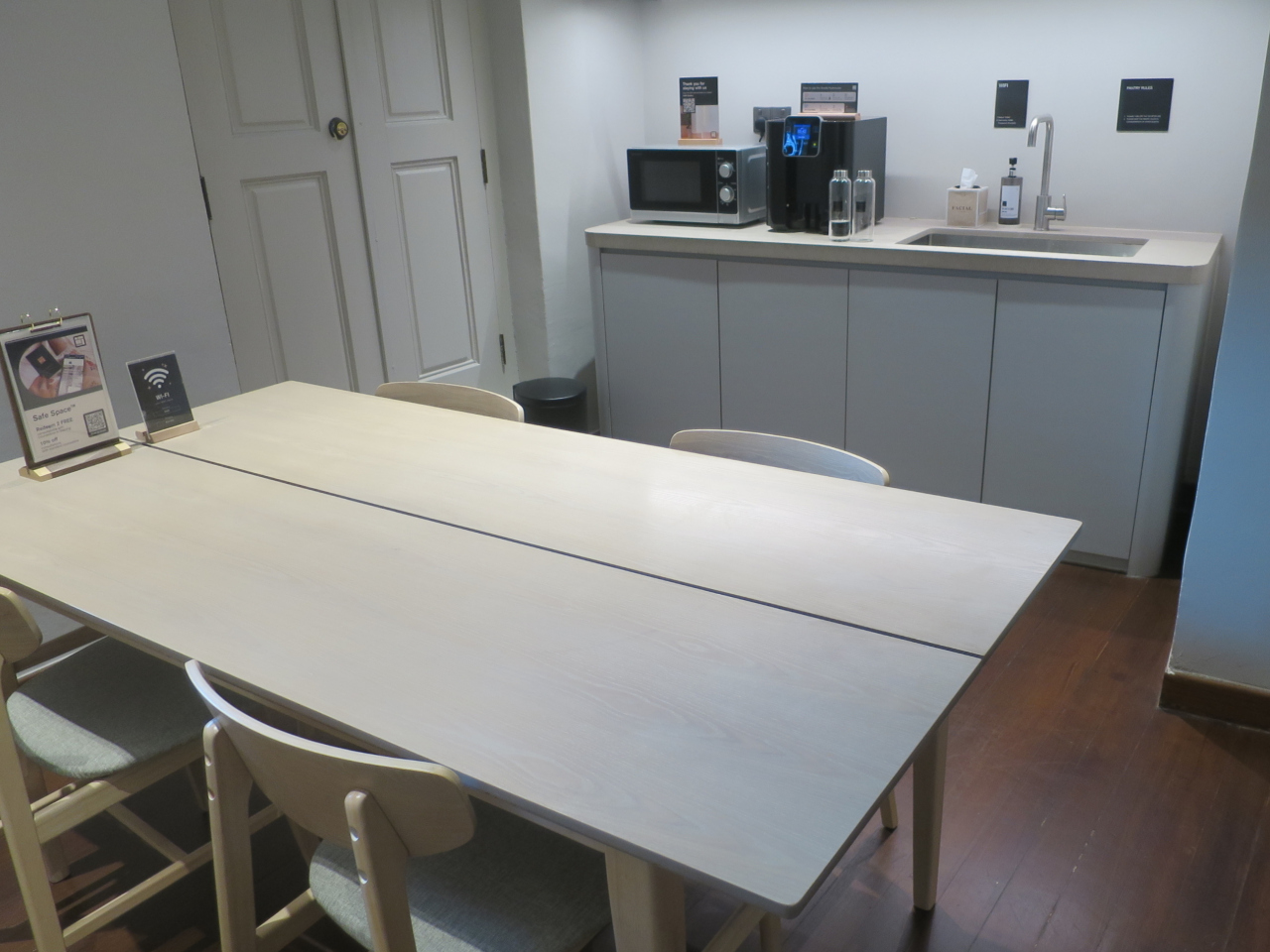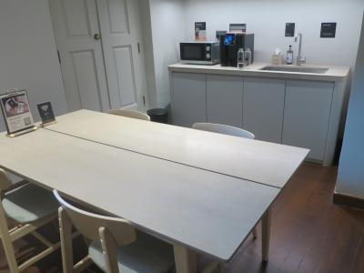 部屋には、湯沸かし、ドライヤーだけでなく、コインランドリー用の大きなバスケットも置かれています。冷蔵庫がない代わり、エレベーターホールと部屋の近くにあったパントリーの冷蔵庫を利用できました。冷蔵庫のドアにある紙に部屋番号とチェックアウト日の記入をお忘れなく。また、パントリーには水のサーバーも置かれていて、ゴミ箱もあるので助かりました。