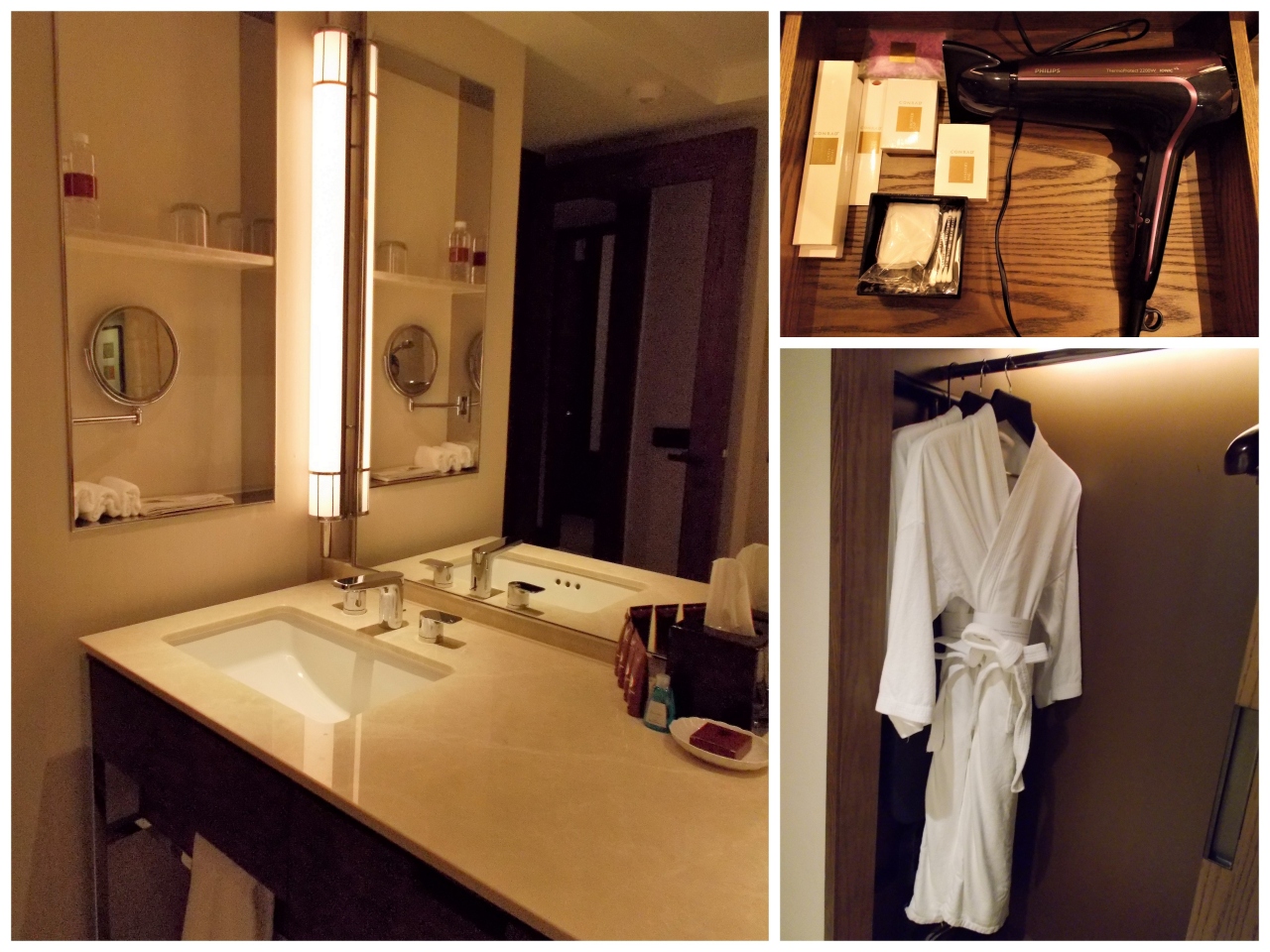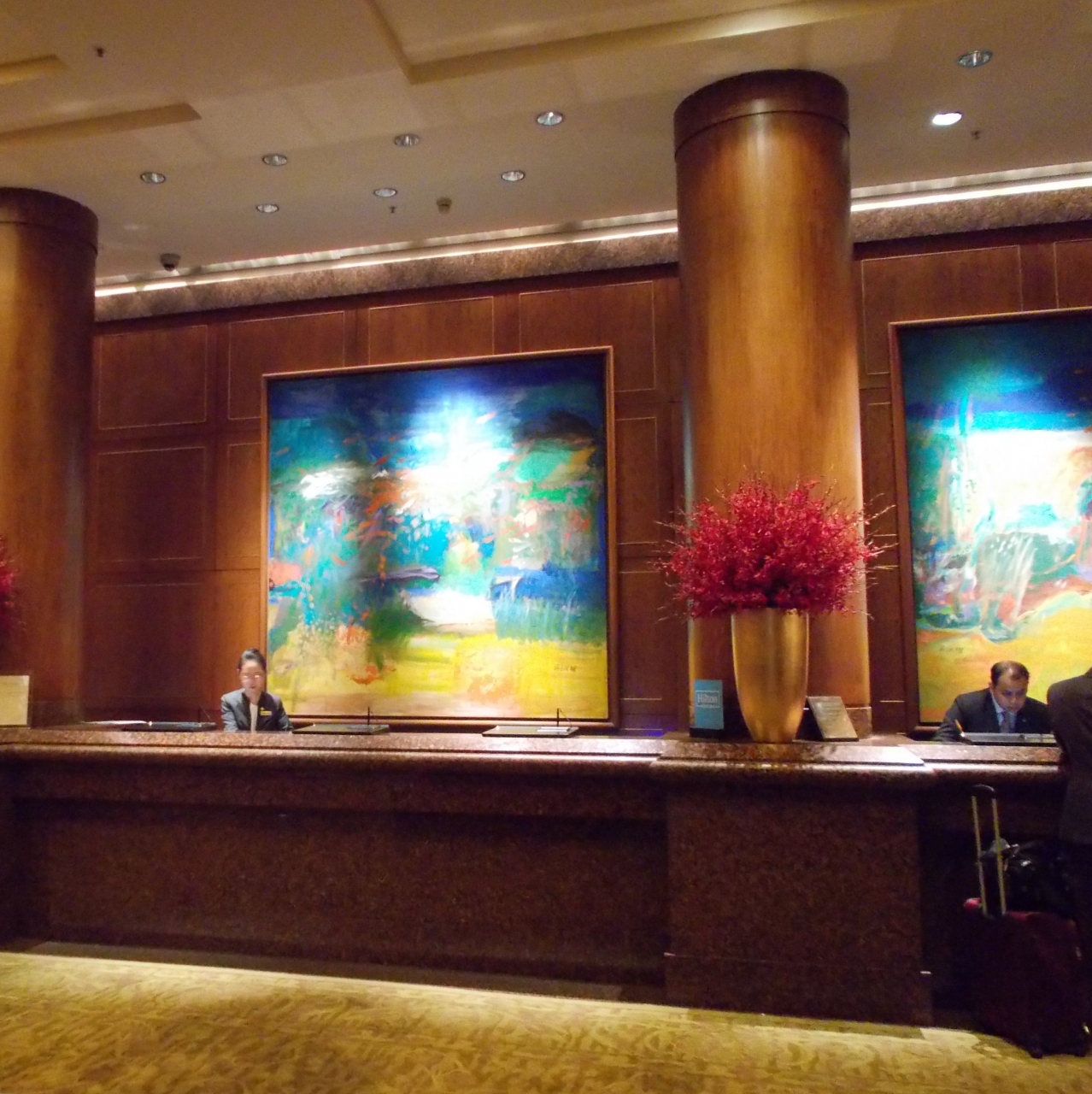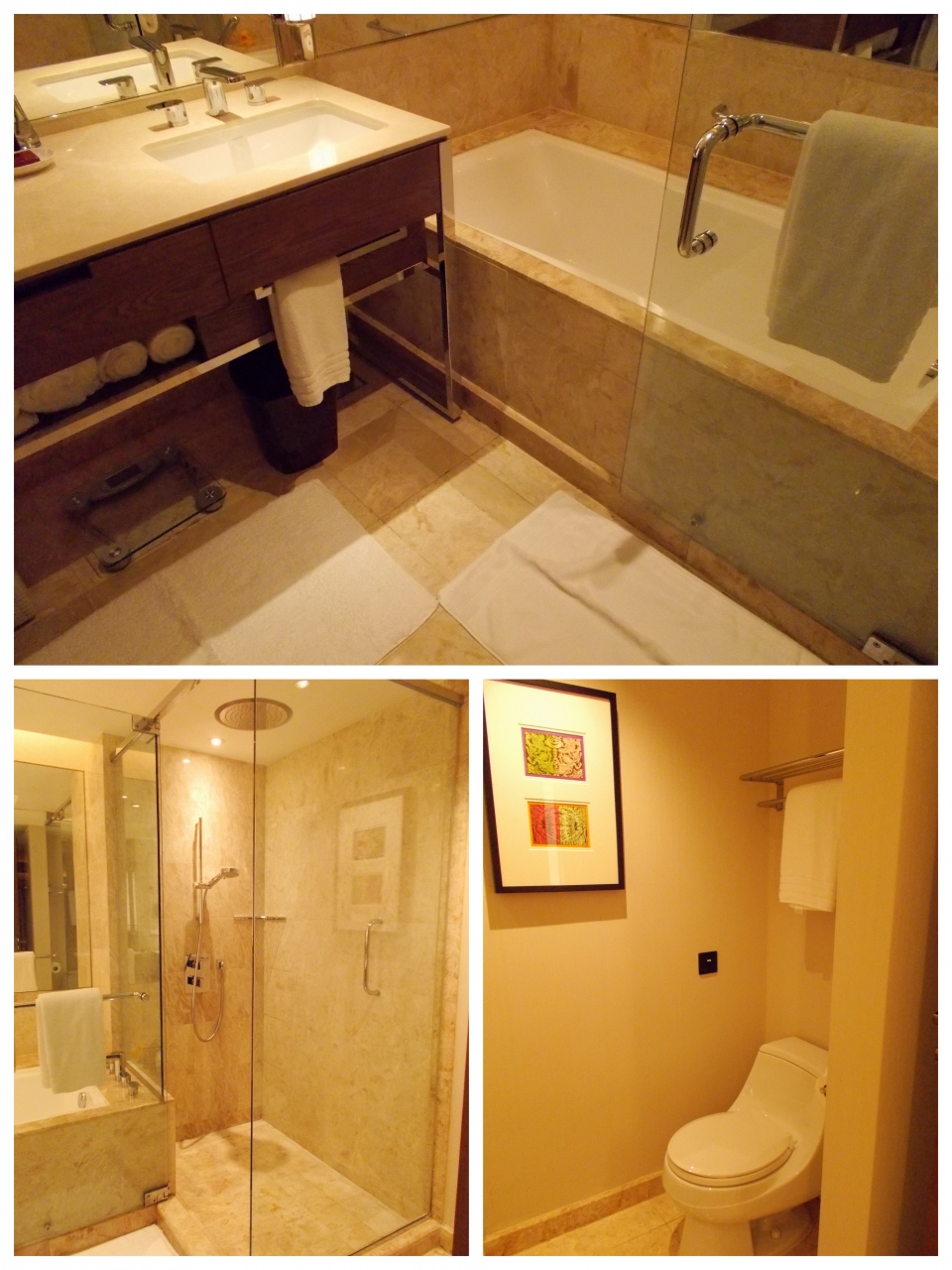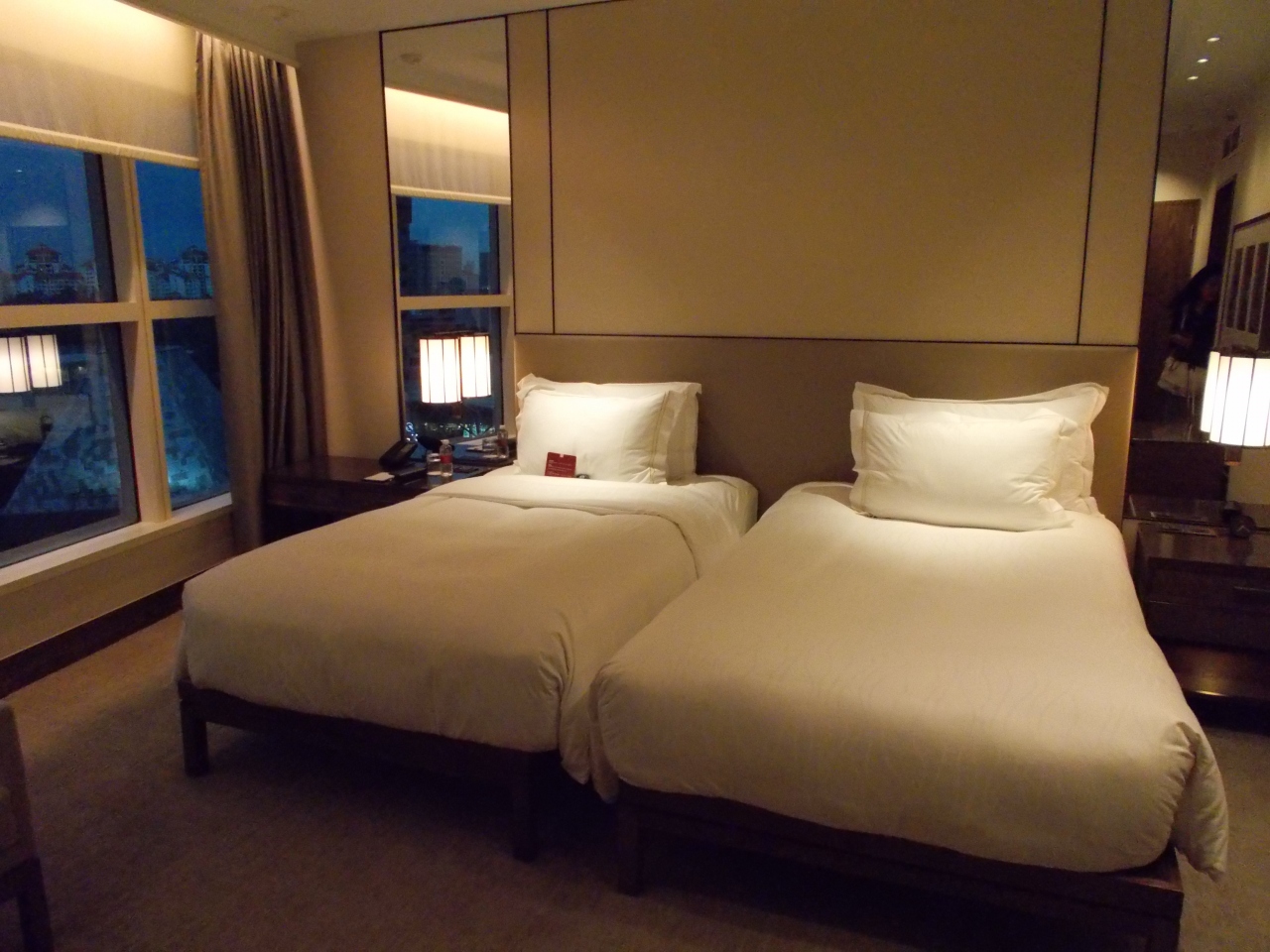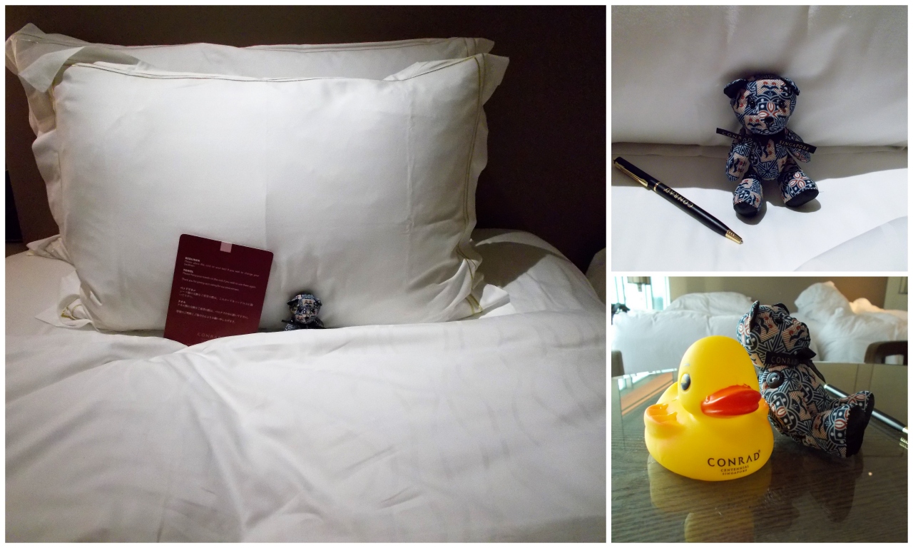 マリーナ地区のホテルとしてはわりとリーズナブルで、部屋の広さは充分。バスルームは洗面台が2つあって便利。バスタブのほかにシャワーブースも。ベッドにはコンラッド・ベア、バスルームにはアヒルちゃんが置かれていました。フロントに日本人女性のスタッフがいて、親切に対応していただけました!