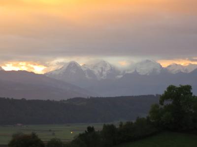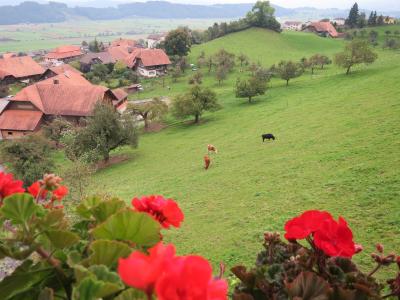 ベルンとトゥーンの中間のキルヒェンツルネンにあるアパートで、隣が小さな牧場という、カウベルの音やニワトリの声も聞こえる、のどかな所です。窓からは村の教会が見え、広がる谷だけでなく、遠くアイガー、ユングフラウを望むことができ、感激しました!