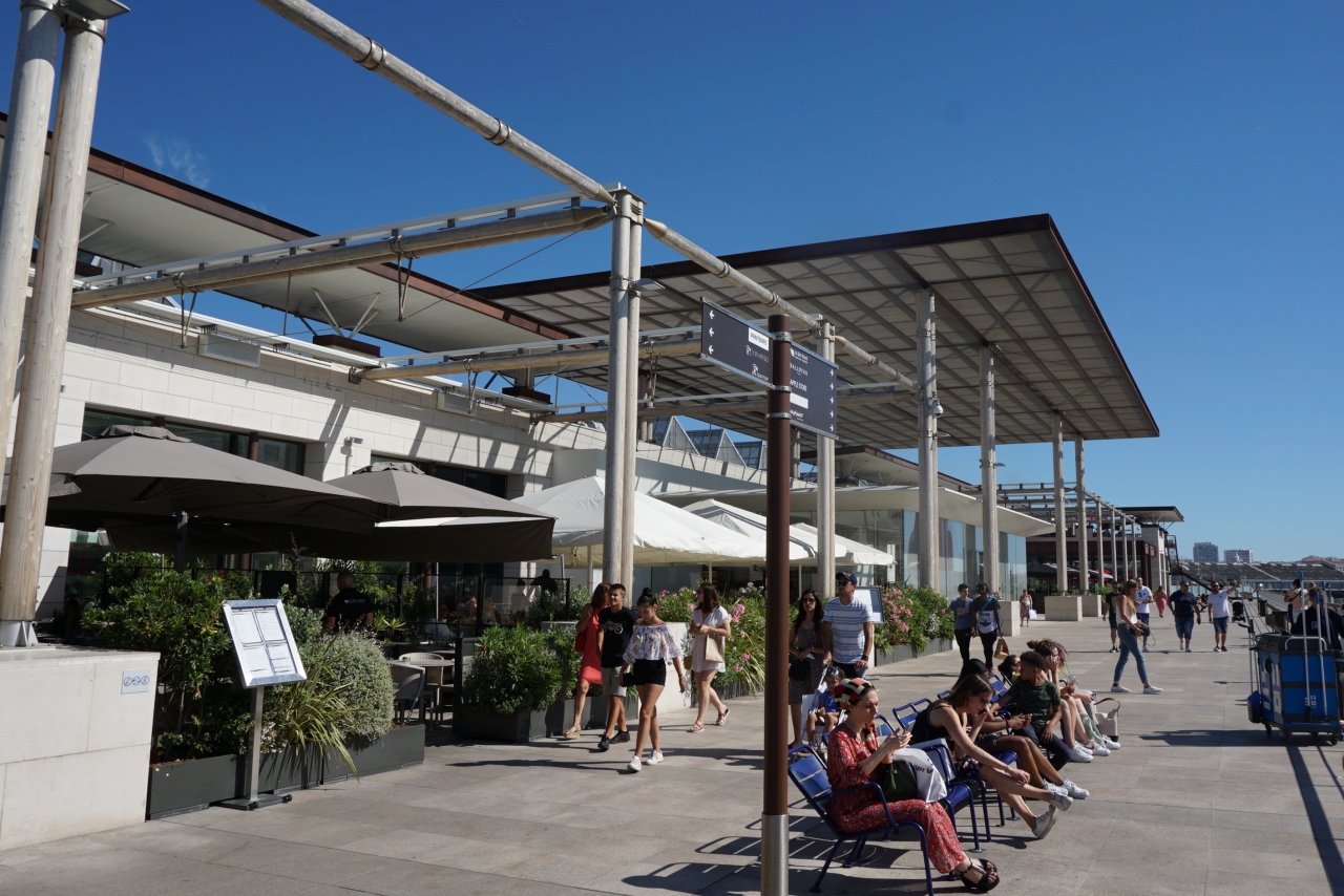 特に、海側にある長く続くテラスがオススメ!ショッピングをしなくても、テラスに来るだけでも、このショッピングセンターを訪れる甲斐があります。新港や、間近に大型客船を眺めることができました。