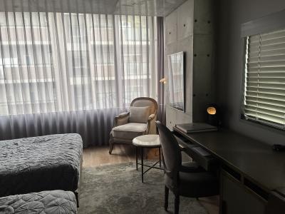 部屋の写真の、赤白のストライプの壁紙に、ガチャガチャしたイメージがあったのですが、実際には落ち着いたデザインでした。部屋はやや狭いけれど、1人がけの椅子2脚と丸テーブルがあるので、部屋での飲食が楽にできました。