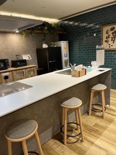 1階には、本などが置かれたカフェスペースがあり、無料で飲めるコーヒーが用意されています。また、カフェスペースの奥には自炊ができる共同のキッチンもあり、部屋にも電子レンジがあって、食事制限がある方や食費を抑えて旅行をしたい方に向いていると思いました。