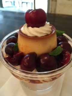 プリンアラモードは、硬めで甘さ控えめのプリンと果物(アメリカンチェリー)、生クリームだけのシンプルなスタイル。量がちょうどいいです。