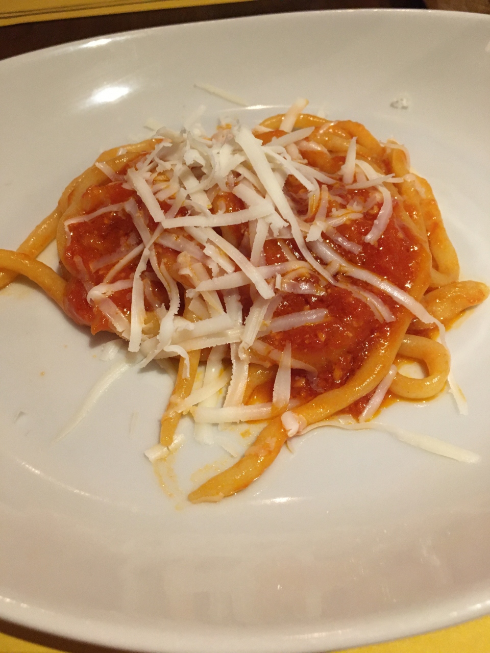 この店で絶対食べてほしいのは、シエナなどトスカーナで食べられている「ピチ」というパスタ。太いうどんみたいな形状で、なかなか茹でるのが難しいのですが、この店のはモッチモチで腰があって最高でした。