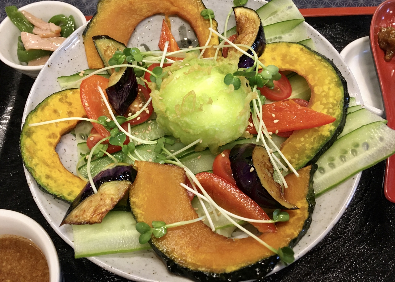 かっぱめんとは、きゅうりの汁を練り込んだきしめんのような乾麺で、きゅうりの名産地である須賀川にちなんで開発されたそうです。ごまだれの冷たいかっぱめんには、きゅうりやかぼちゃの天ぷら、揚げ卵などいろいろな具が乗っていて、味噌をとき混ぜながらいただきます。