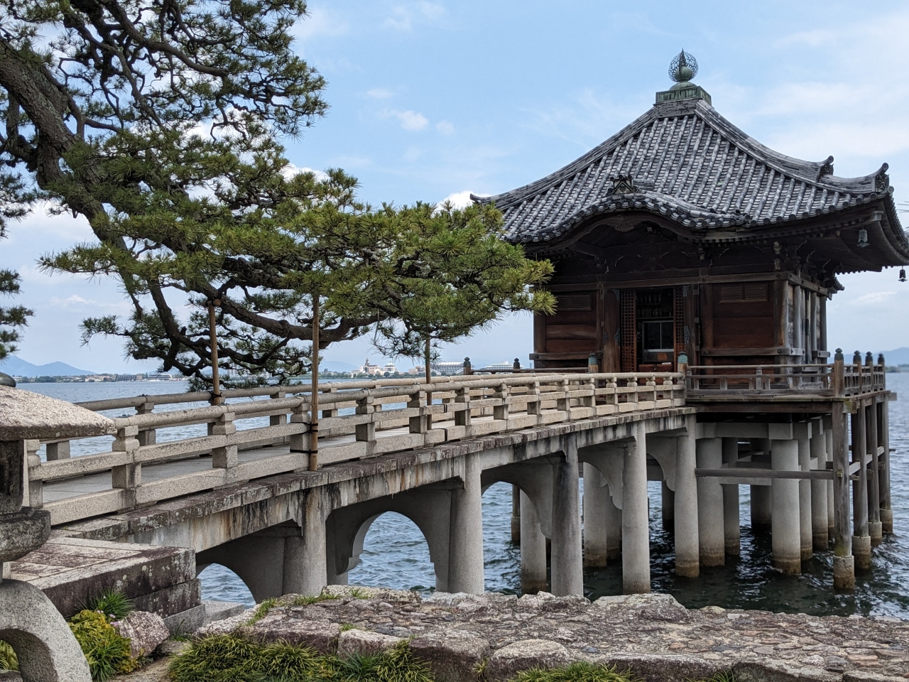 橋をわたり回り込むと浮御堂のお堂が琵琶湖側にあり、正面に近江富士、左側には琵琶湖大橋が見渡せます。近江八景の一つ 堅田の落雁が描かれたのも頷けました。