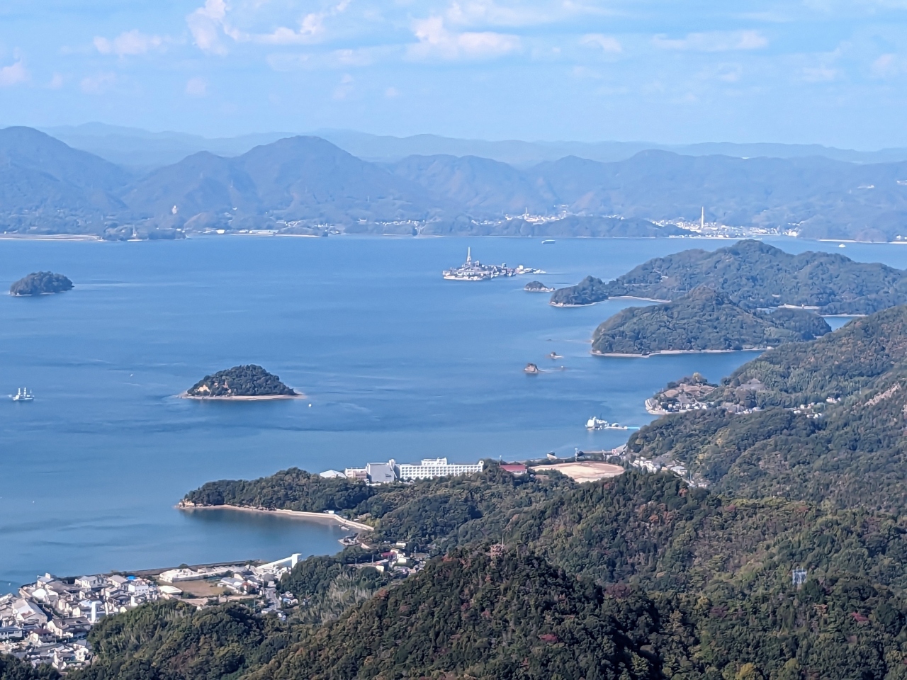 海岸線すぐそばを高く登った所に建つホテルなので、瀬戸内海の多島美を臨めます。