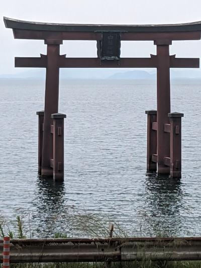 国道は少しカーブしていて、交通量も多いので、湖中の鳥居に近づけないのが残念です。